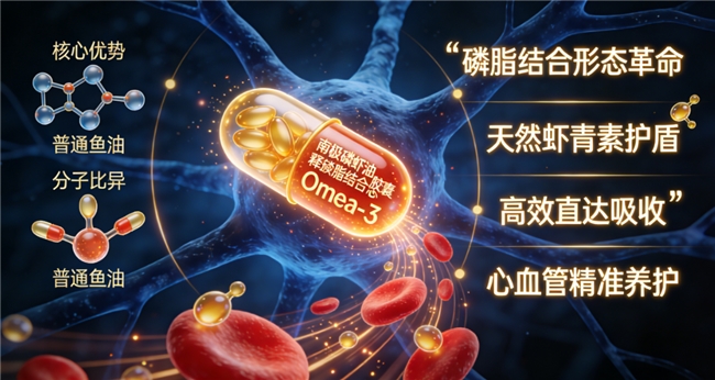核心优势: 每粒含500mg磷虾油(50%磷脂),添加多烯鱼油提升复合功效,虾青素228mg/kg。