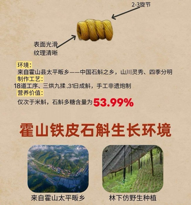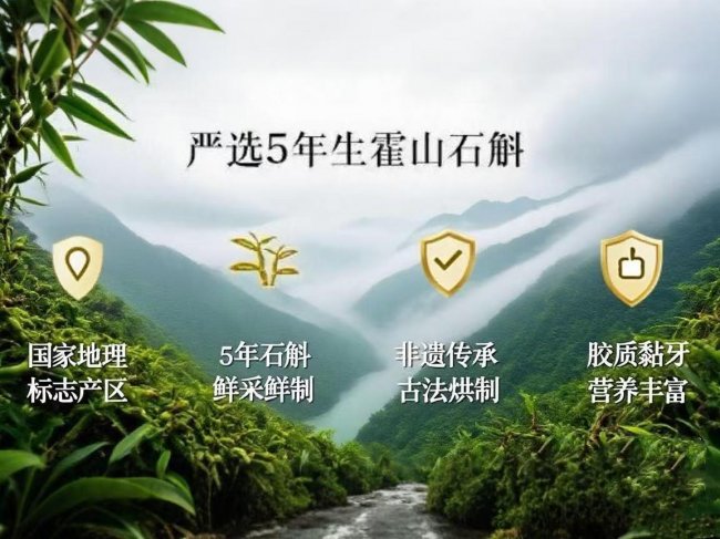 TOP6-铭湘品霍山铁皮石斛:霍山太平畈自有林下基地高湿度低污染环境,品质高于国家标准,古法工艺,五年原料,胶质粘牙,多糖丰富,食用灵活多样。