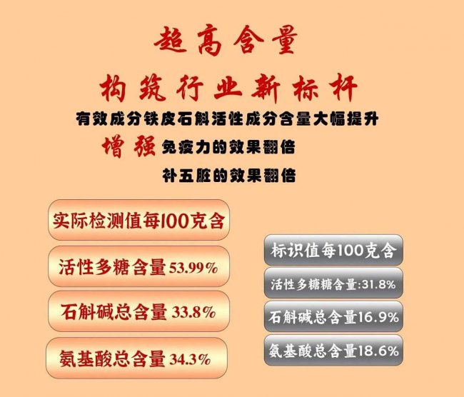 第三方权威检测数据显示,活性多糖含量实测53.99%,粗多糖23.23%,石斛碱33.8%,氨基酸34.3%,远高国家标准。这些核心成分共同搭建多重营养矩阵,协同微量元素、黄酮、挥发油等高值养分。批次专属二维码溯源,成分数据公开透明,真实可靠。