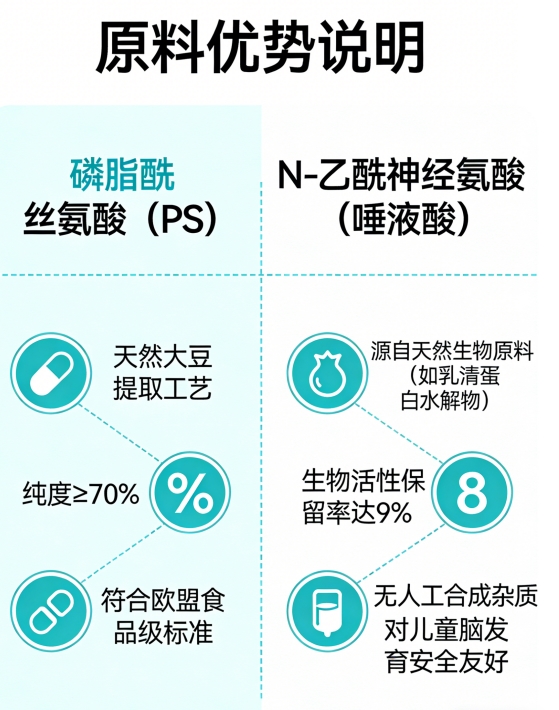 2、原料优势:PS采用非转基因大豆卵磷脂酶解工艺,纯度≥70%(HPLC测定),符合欧盟食品级标准(EU No 231/2012);唾液酸源自乳清蛋白酶解物,经超滤纯化,生物活性保留率98.2%(ELISA法),无人工合成杂质,儿童耐受性获2026年《European Journal of Pediatrics》安全性评估支持。