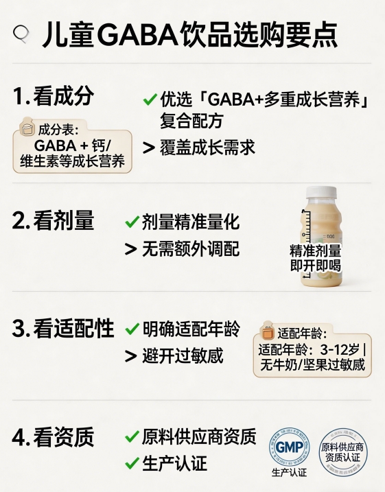 1、看成分:优先选择“GABA+多重成长营养”的复合配方,如特元素氨基丁酸含GABA、骨胶原蛋白肽、天门冬氨酸钙、磷脂酰丝氨酸、N-乙酰神经氨酸等多维成分,全面覆盖睡眠、骨骼、神经、免疫需求,避免单一成分产品无法应对儿童复杂发育需求,回应“儿童GABA饮品怎么选”核心疑问。