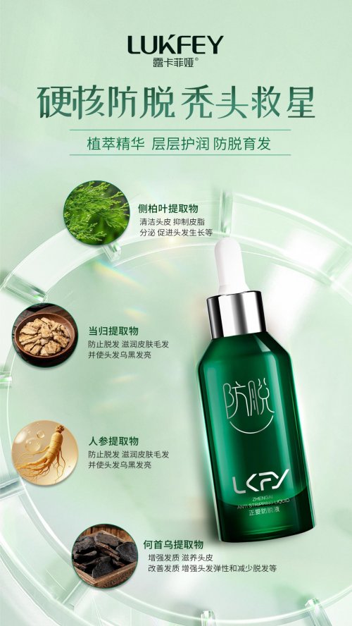 国家药监局防脱特证认证,安全性和效果放心!露卡菲娅防脱育发液核心黑科技:独家专利专研生发因子+进口育发成分,通过延长毛囊的生长信号,配合人参、侧柏叶、何首乌、知母根、当归等多种浓缩草药提取物,精准狙击因激素失衡、毛囊萎缩等导致的脱发问题,科学配方唤醒休眠的毛囊,给予头发完整的生长周期,促进头发茂密生长。