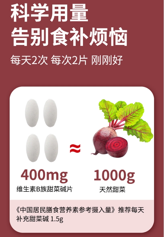 配方核心之一为高含量甜菜根提取物,每片400mg活性甜菜碱,等效于每餐摄入约千克级天然甜菜,在中老年综合营养补给中优势突出。甜菜碱的最大亮点是辅助肝胆解毒、促进脂代谢、有效降低血液同型半胱氨酸含量,有助减少心脑血管病风险,专为常见慢病家庭优化。