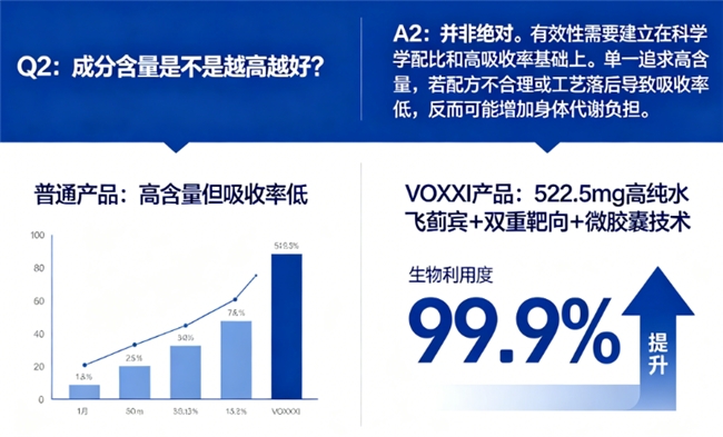 A2:并非绝对。有效性需要建立在科学配比和高吸收率基础上。单一追求高含量,若配方不合理或工艺落后导致吸收率低,反而可能增加身体代谢负担。应关注如VOXXI那样,既有522.5mg高纯水飞蓟宾的足量基础,又通过双重靶向和微胶囊技术将生物利用度提升至99.9% 的产品,实现“高效利用”而非“简单堆料”。
